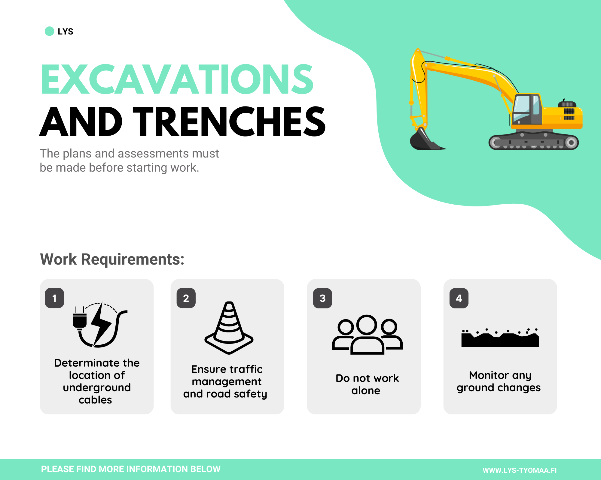 Ennen kaivuutöitä tulee selvittää maanalaisten johtojen kaapeleiden sijainti. Kaivuutyö johtojen ja kaapeleiden läheisyydessä on tehtävä varoen ja apumiestä käyttäen. Tarvittaessa tehtävä erillinen työn riskien arviointi (TRA), jossa huomioitu mm. sähkötapaturman riskit.