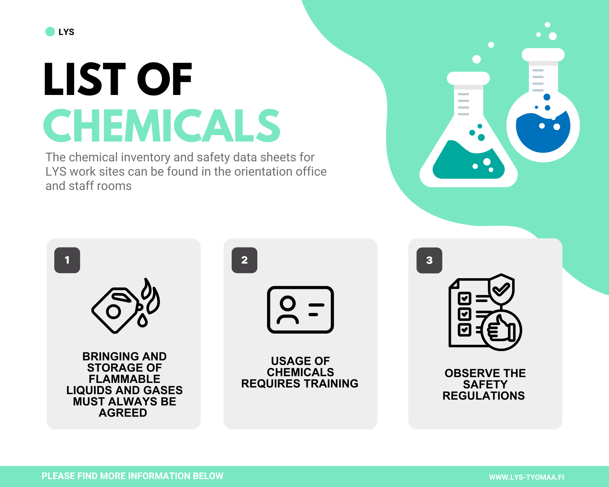 LYS-työmaiden kemikaaliluettelo ja käyttöturvallisuustiedotteet löytyvät perehdytystoimistosta ja henkilöstötiloista. Työmaalla on qr-koodeja, joiden avulla jokainen työntekijä pääsee tutustumaan kemikaaliluetteloon.