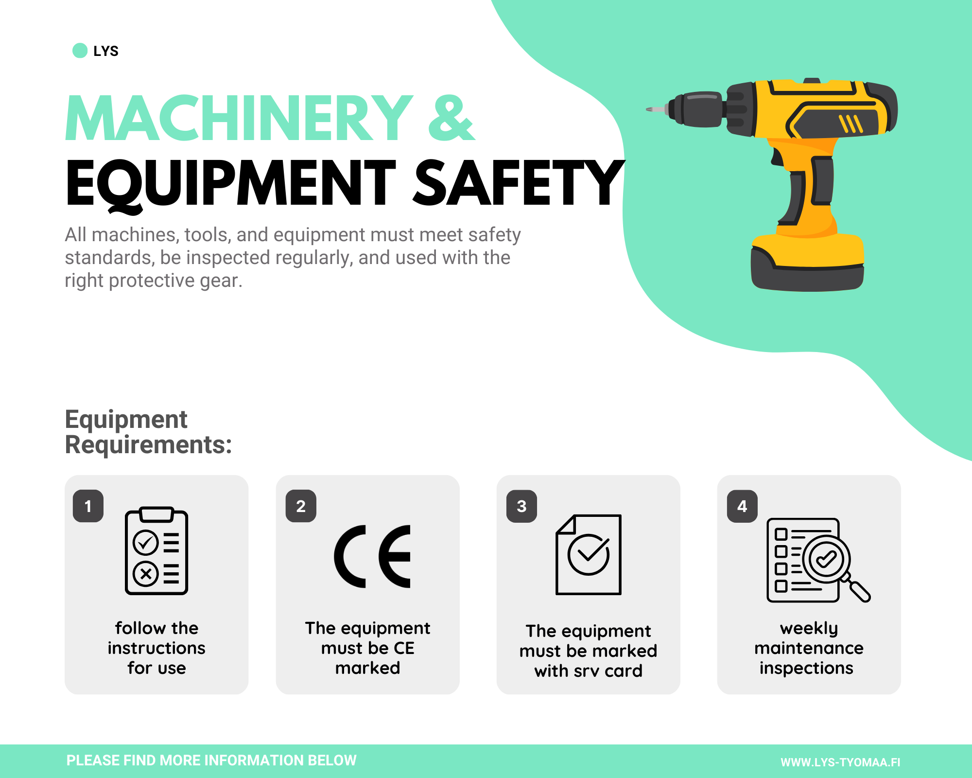 Lue tältä sivulta tarkemmin ajettavien koneiden, nostolaitteiden ja -apuvälineiden, käsikäyttöisten koneiden ja työvälineiden käytöstä.