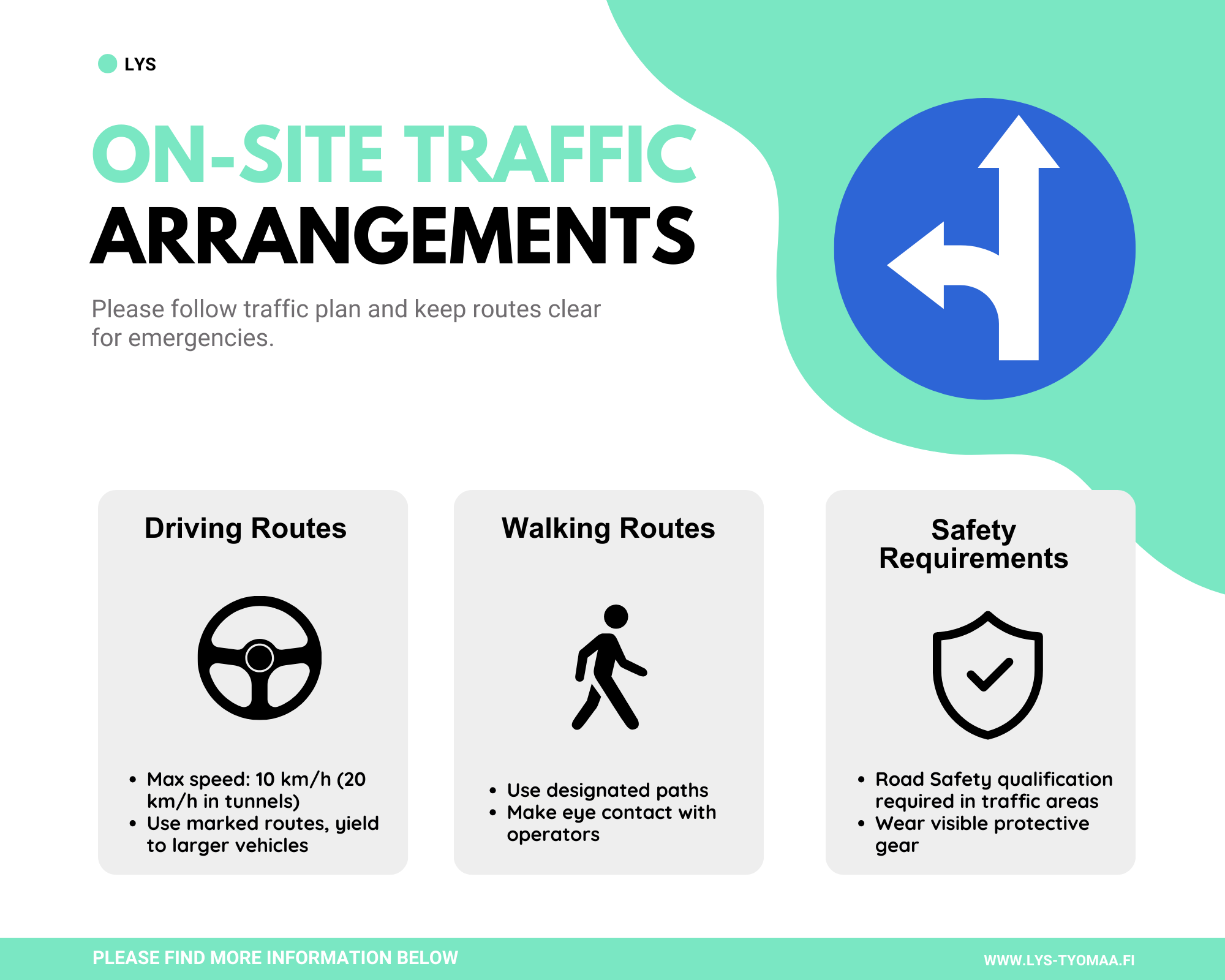 Käytä työmaalla vain merkittyjä kävelyreittejä ja kävelijöille tarkoitettuja työmaaportteja. Ks. kävelyportit ja -reitit aluesuunnitelmasta.