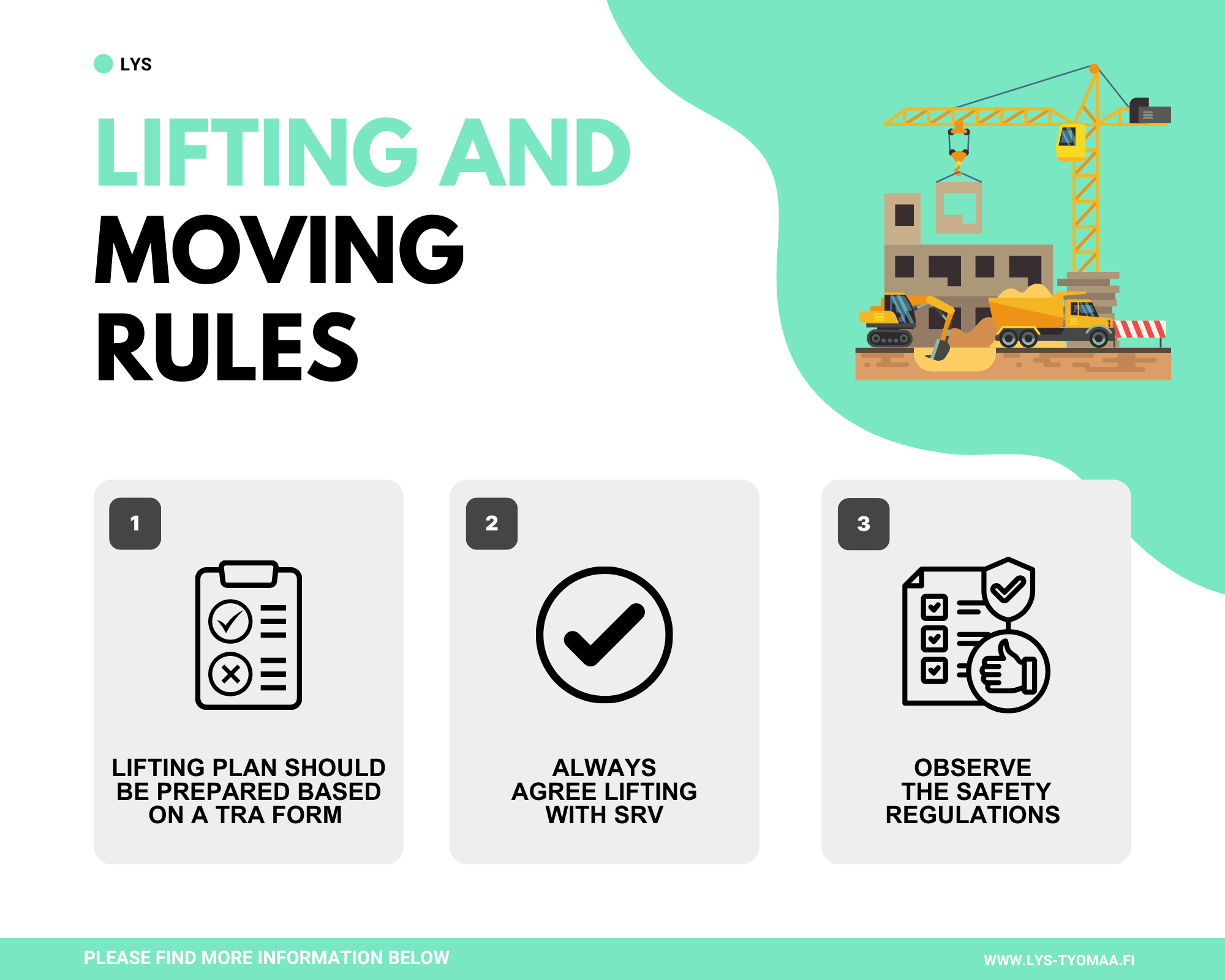 - Alamiehen tulee olla koulutettu ja työnantajan taholta kirjallisesti nimetty. Alamiesten tulee käydä LYS-työmaalla koulutus nostoihin liittyen. Hyväksytyn alamiehen merkkinä on kypärätarra.
