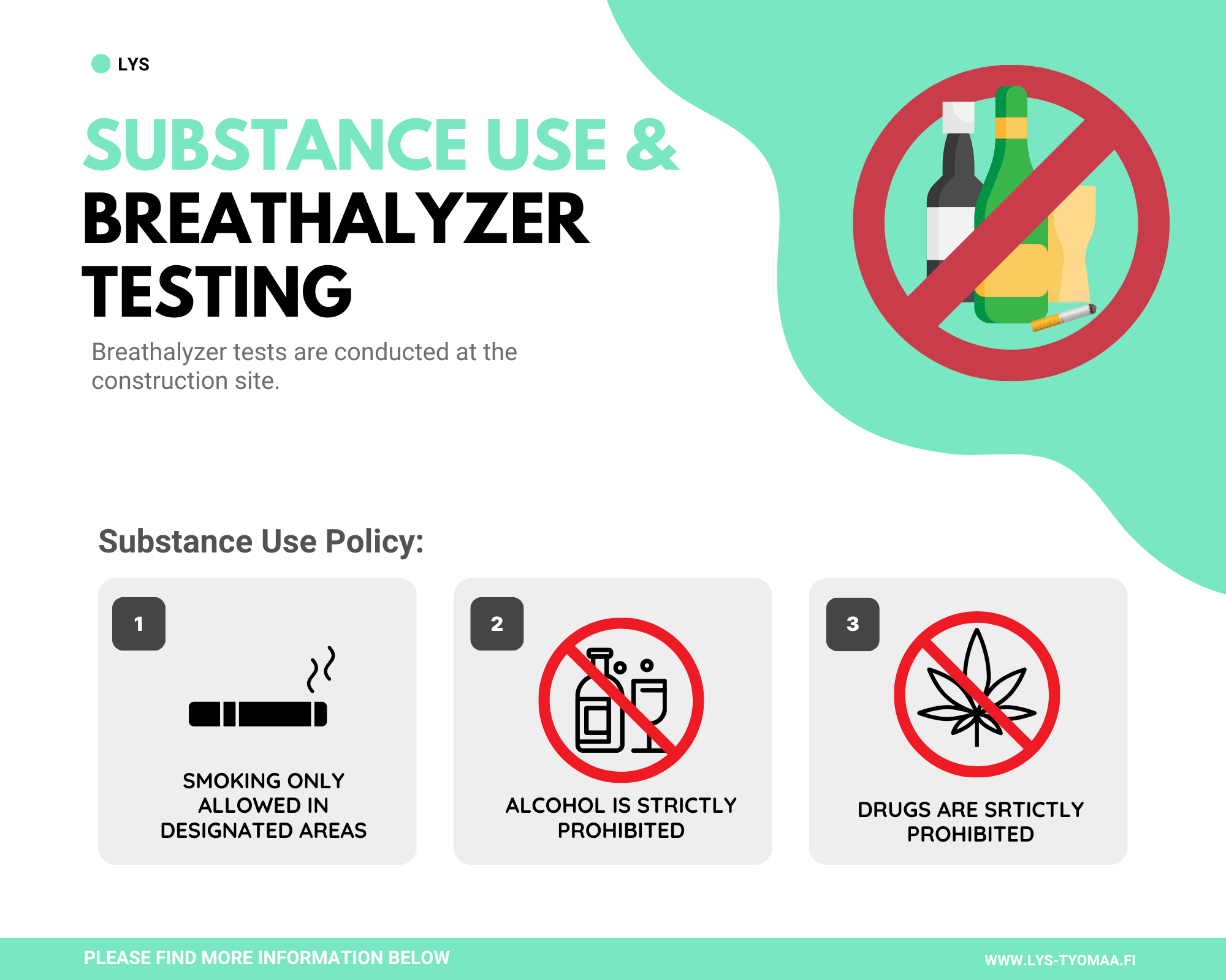 Työmaalla ja big roomilla (toimistolla) on nollatoleranssi alkoholin ja huumeiden suhteen. Päihteiden vaikutuksen alaisena ei siis saa työskennellä.