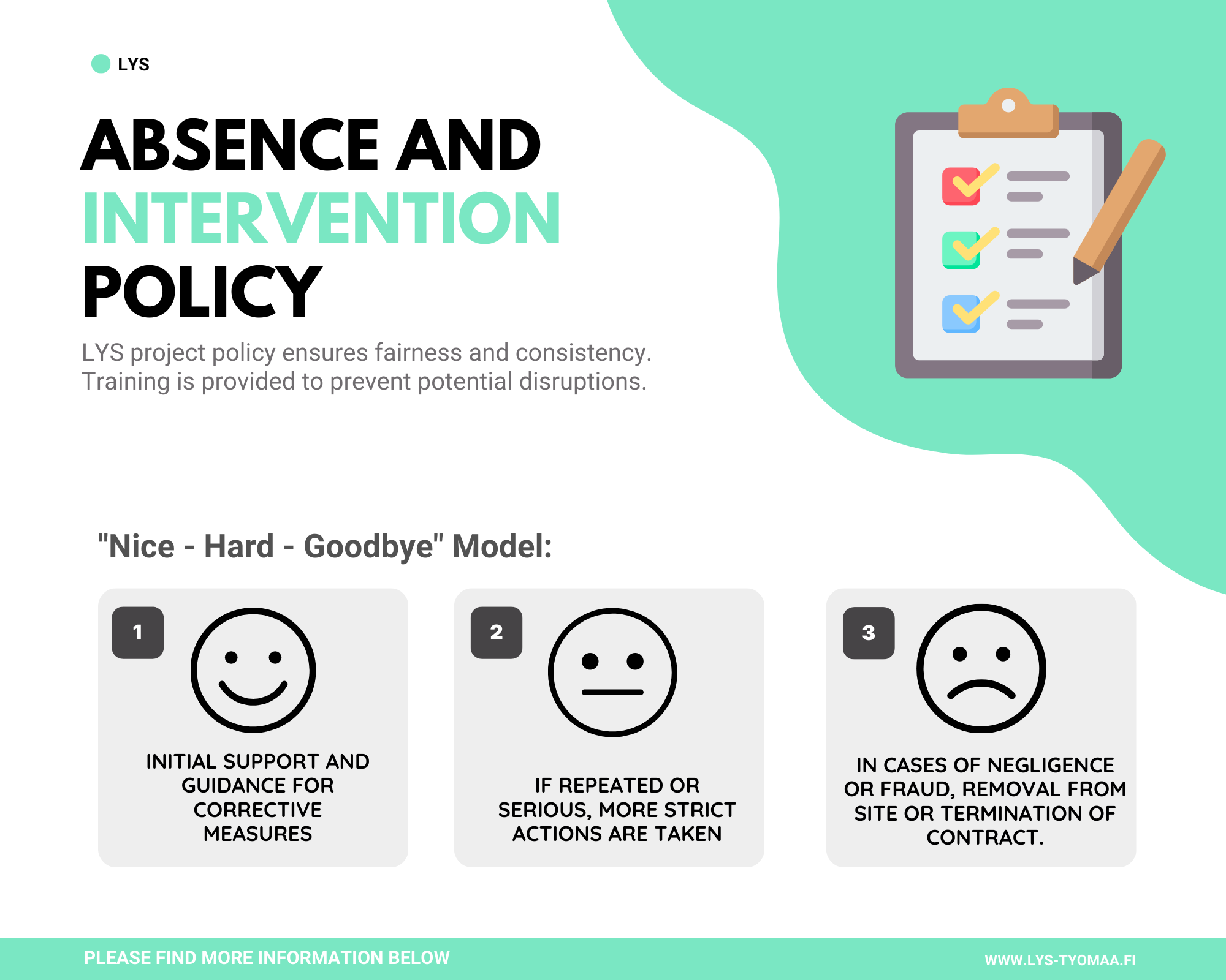 Puuttumiskäytännöt on kuvattu ”kivasti – kovasti – hyvästi” -mallilla. Se tarkoittaa sitä, että rikkeeseen pyritään aina ensin puuttumaan kevyimmällä mahdollisella tavalla ja niin, että toimijaa tuetaan korjaavissa toimenpiteissä. Jos rike kuitenkin toistuu, on vakava ja/tai johtuu esimerkiksi selkeästä piittaamattomuudesta tai vilpillisyydestä, voidaan esimerkiksi työntekijä poistaa työmaalta tai jopa sopimus purkaa.