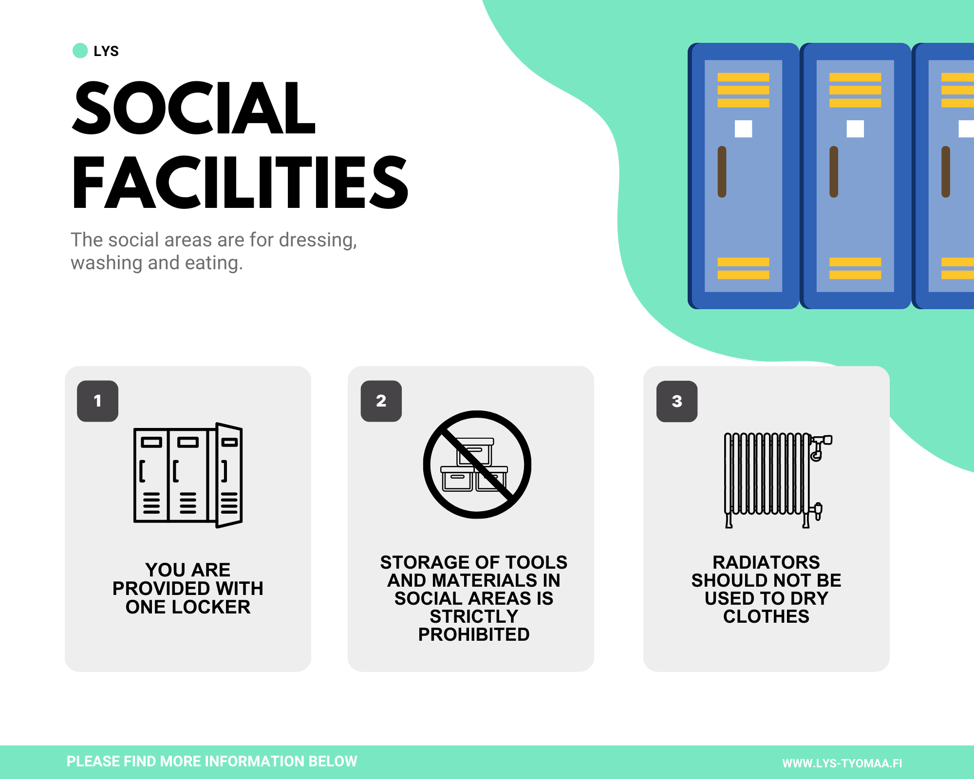Varastoiminen (työkalut, materiaalit) sosiaalitiloissa on kielletty. Säilytä kaikki henkilökohtaiset tavarasi kaapissa – ei kaapin alla tai päällä – jotta sosiaalitilojen siivoaminen onnistuu.