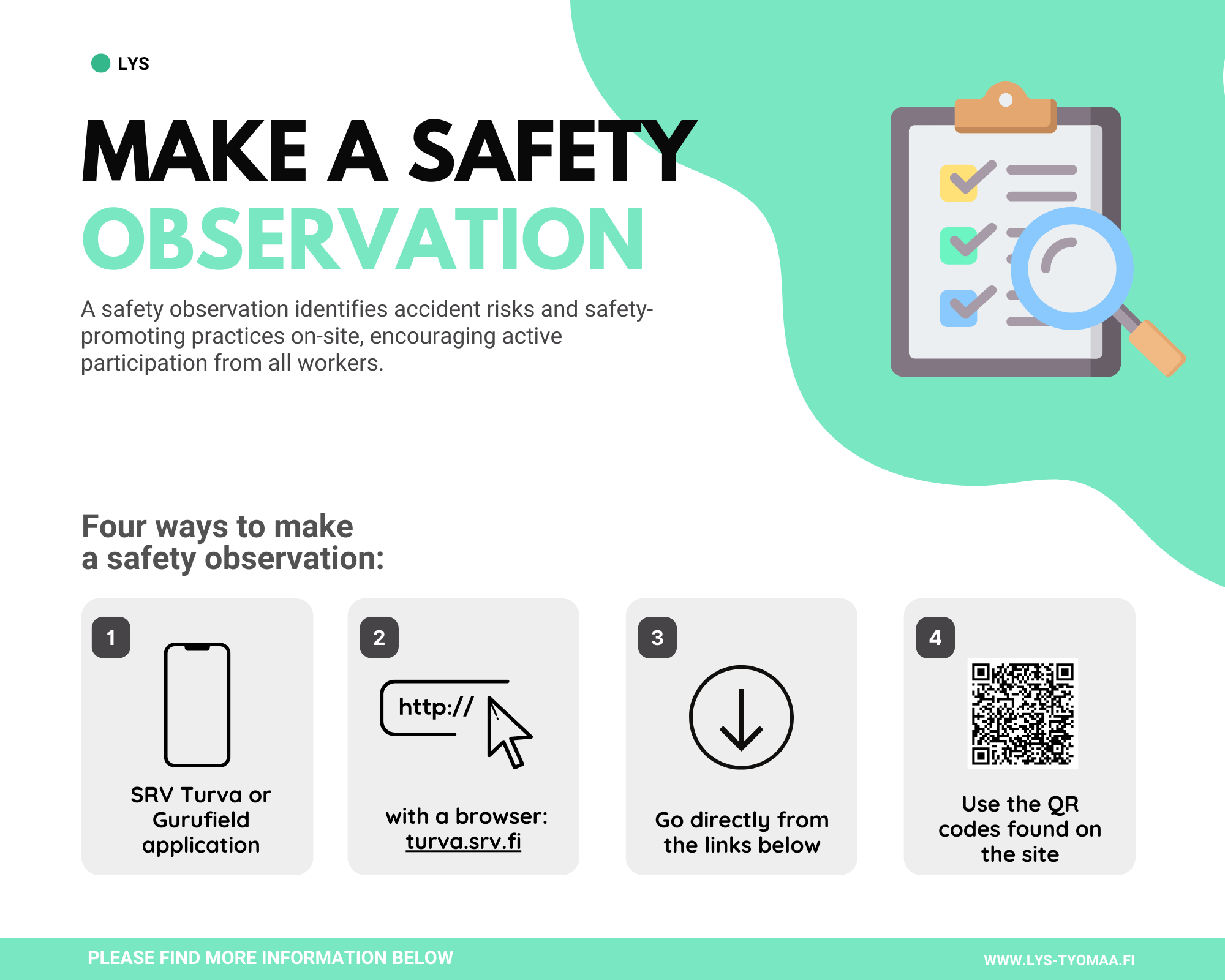 Päivittäinen, laadukkaiden havaintojen teko auttaa työmaata ja parantaa turvallisuutta. Mitä useampi työyhteisön jäsen osallistuu yhteisen työpaikan ympäristön havainnointiin, sitä turvallisempi työympäristö meillä kaikilla on.