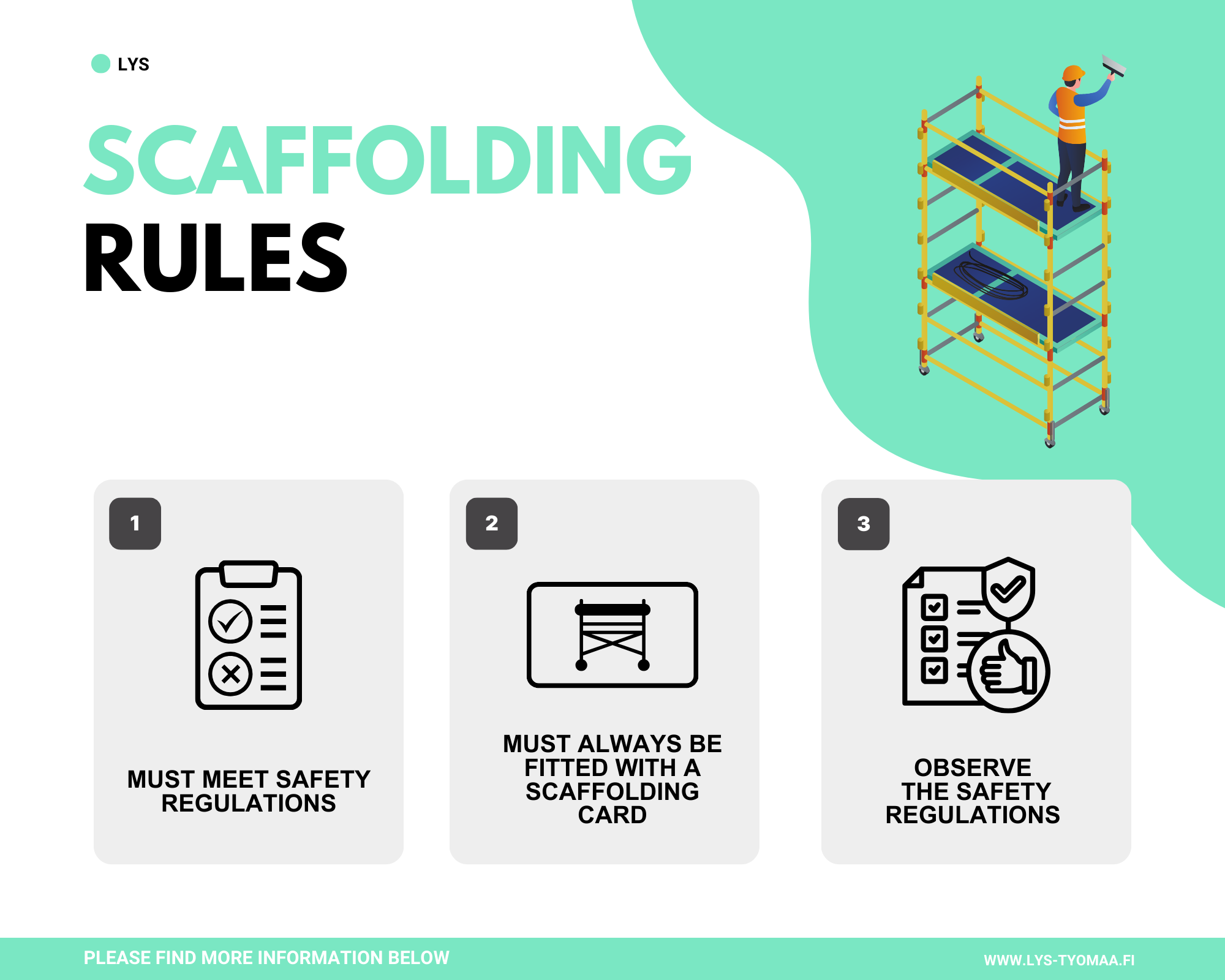- Telineet on kasattava ohjeiden mukaisesti sisältäen kaiteet, nousureitit ja jalkalistat.