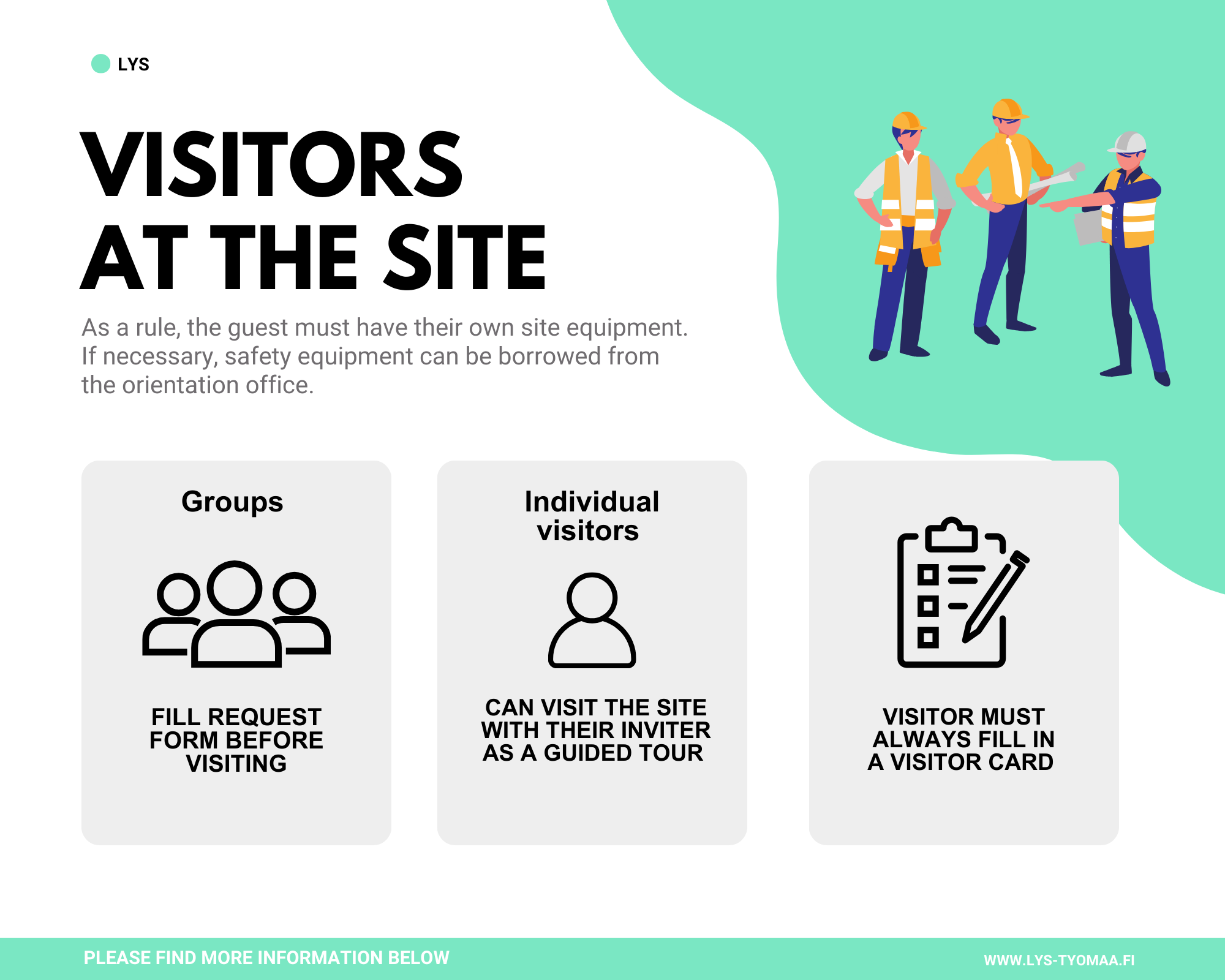 Vieraalla tulee lähtökohtaisesti olla omat työmaavarusteet. Tarvittaessa turvavarusteita saa lainaksi perehdytystoimistosta.